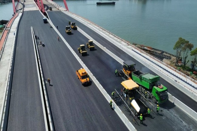 集團(tuán)蘇州勝浦大橋項(xiàng)目順利完成主橋面層瀝青攤鋪工作