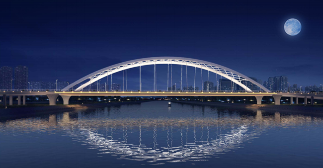集團(tuán)承建的二里橋路跨京杭運(yùn)河節(jié)點工程(曲江大橋)項目連續(xù)上跨濱河西路、京杭運(yùn)河、東外灘路(規(guī)劃),主橋采用“鋼箱提籃拱”結(jié)構(gòu),由拱肋和交織的橫撐組成,相依相靠,形成穩(wěn)定結(jié)構(gòu)。設(shè)計靈感源自揚(yáng)州“月亮城”的文化意象。側(cè)觀橋體,兩向內(nèi)收攏的拱肋形如彎月,網(wǎng)狀橫撐交織成輕盈的弧線;夜間燈光亮起時,橋影與水中明月相映成趣,恰似“二分明月落長河”的詩意畫卷。橋型勾勒出了古樸靜謐的揚(yáng)州,穿越千年,風(fēng)姿如故,它宜清風(fēng)、宜月色,人與自然相互包容,與揚(yáng)州打造“文化旅游名城、生態(tài)宜居名城” 的規(guī)劃相得益彰。